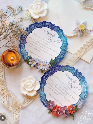 Apoi am revenit la un vechi hobby pe care îl am de când sunt mică, și anume quilling (rularea unei fâșii de hârtie și modelarea ei în diferite forme după). Acest hobby a ținut mai mult ca primul și chiar am făcut câteva produse interesante. Îmi amintesc că la un moment dat chiar am lucrat la niște sute de invitații ca în ultima imgine. Atât rama cât și florile aplicate după le-am lucrat manual 100%, și au fost primii bani "seriosi" caștigați din handmade. Îmi amintesc cât de încântată am fost și această primă comandă mi-a dat curaj să continui să experimentez. Mi-a plăcut mult să fac și steluțele albe ca decor de brad și am ajuns chiar și să fac un tablou.